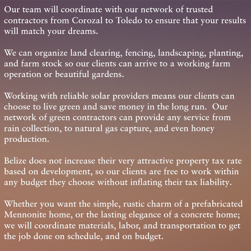 We are a Canadian company operating in Belize with decades of experience with the process of relocating to the beautiful jewel of the Caribbean. We work with reputable contractors, lawyers, agents, and businesses to bring your dreams to life.
